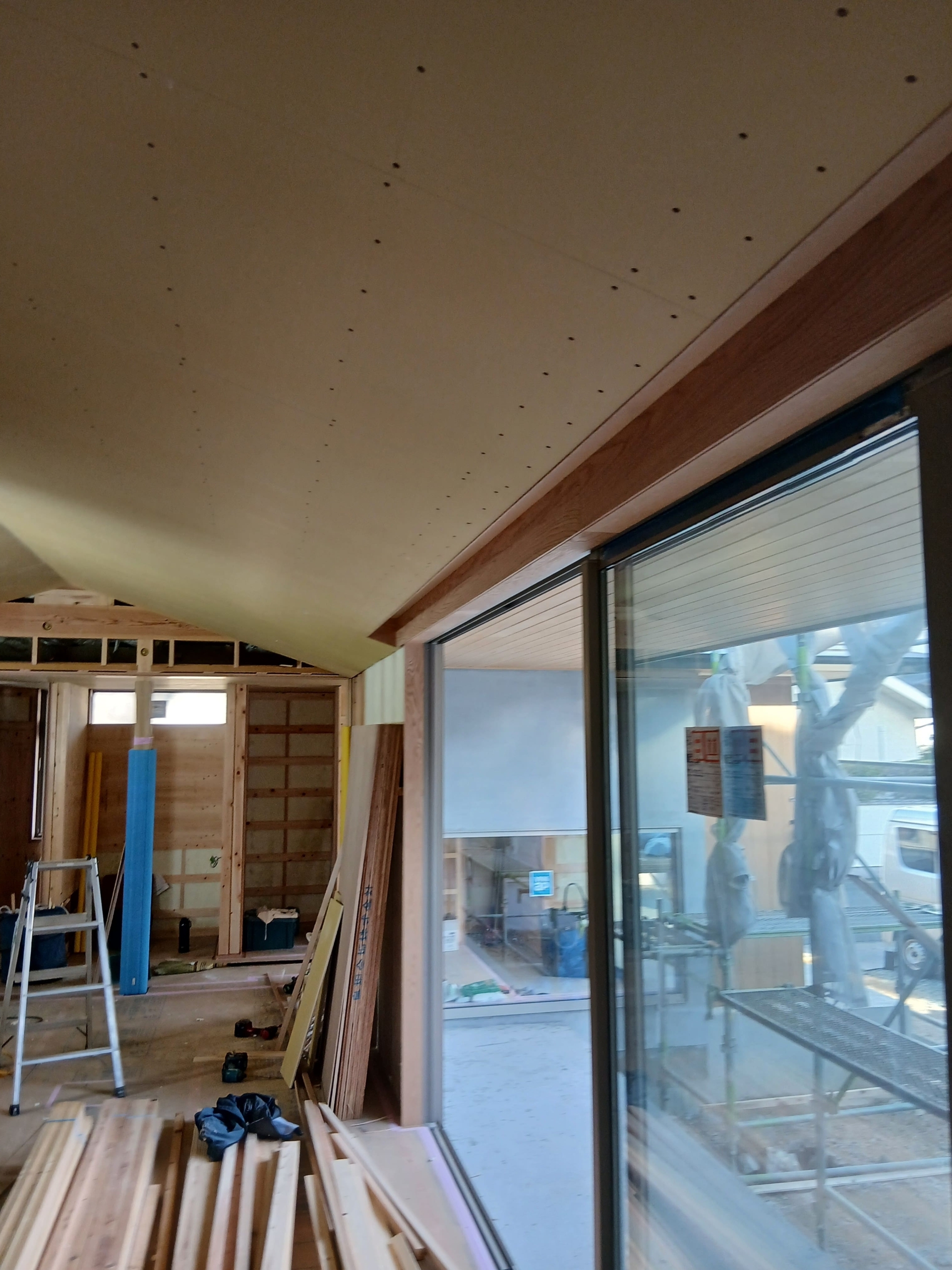 今回の現場はLDKの天井が勾配天井とカーテンBOXが合わさった納まりになっています。
