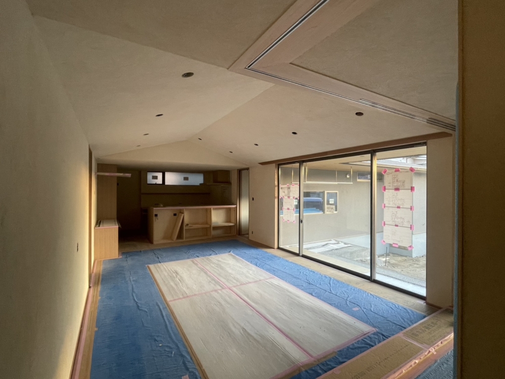 笠岡市で進行中の平屋ですが先週内装仕上げの工事が終わり、器具の取付け等を行っています。