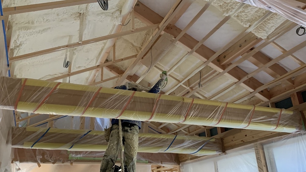 11月下旬に上棟し先日断熱工事の吹付が完了しました。