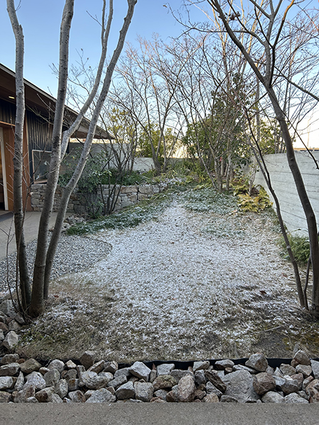 今朝の木ままの庭。なんと、雪景色です!