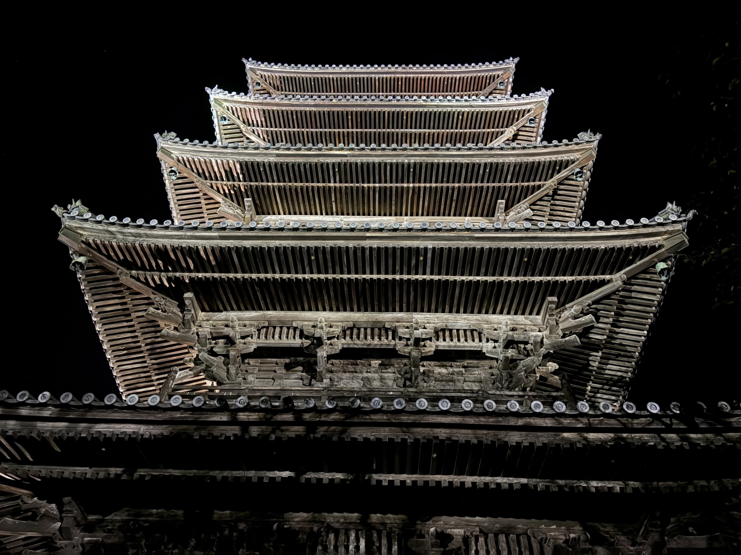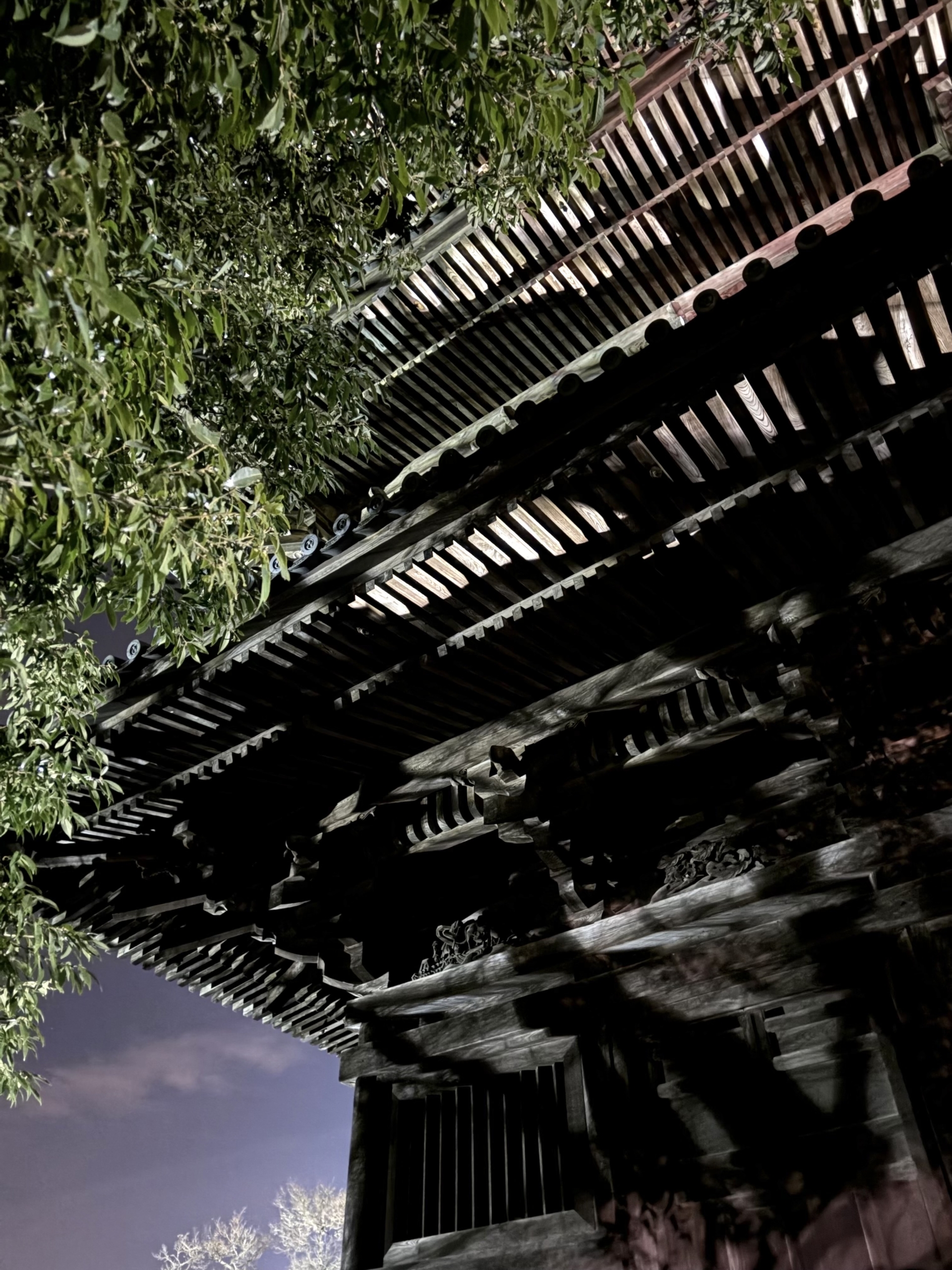 下から照らされ、垂木などの構造が昼に見るよりも陰影が出て、立体的に見えました。