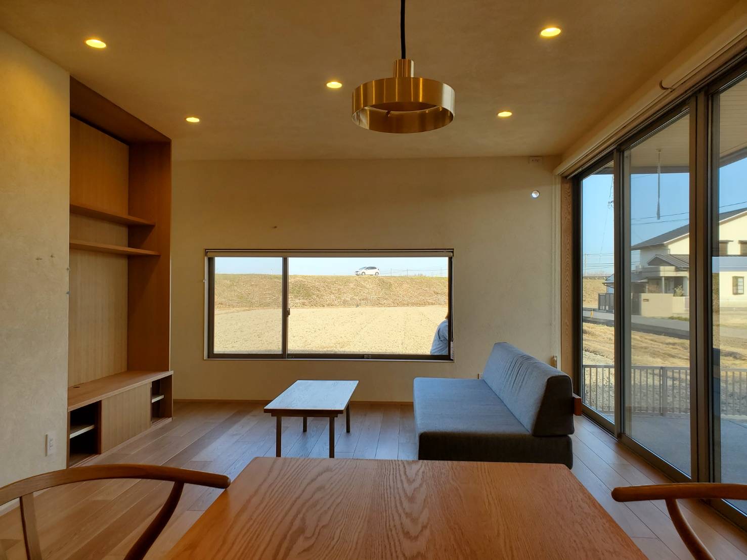 長い造作のカウンター付きダイニングテーブルや格子扉付きの造作TVボードなど、お客様のこだわりを感じました、、、