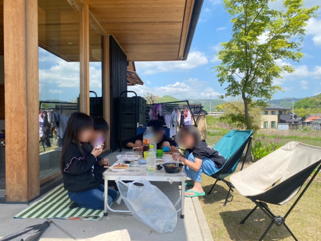 お子様達が軒下で仲良くお昼ご飯を食べていたり、庭で元気よく遊んだりと、