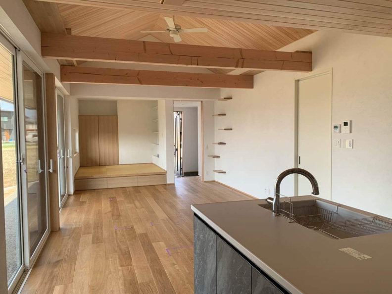 岡山県総社市の「笑顔がつながる家」では内装工事が完了し、内部足場が解体されました。