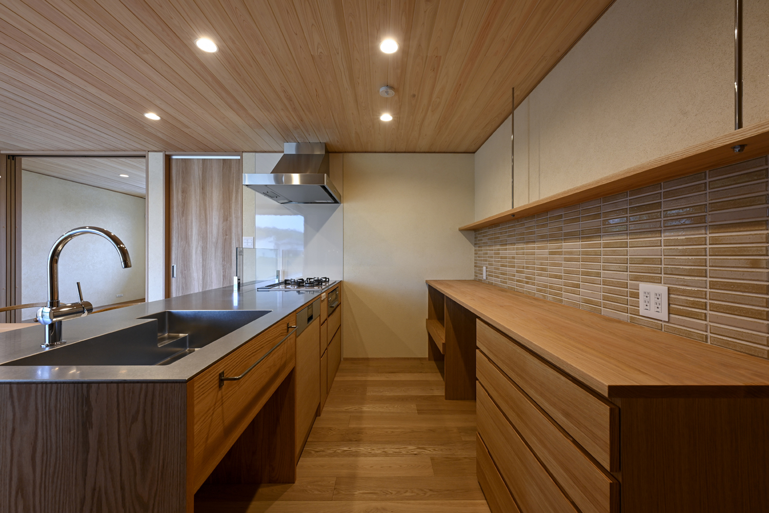 LDKのフラットの板張天井から軒天のつながりを大切にした空間、グレーとアイボリーを使い分けた木まま漆喰壁の内観、奥様こだわりの木ままオリジナルの造作キッチン、一部アクセントタイル張りのカップボード、洗濯室からつながるランドリールーム、小上がりの寝室、LDKからフラットでつながるプライベートガーデンなどのこだわりが詰まっています。