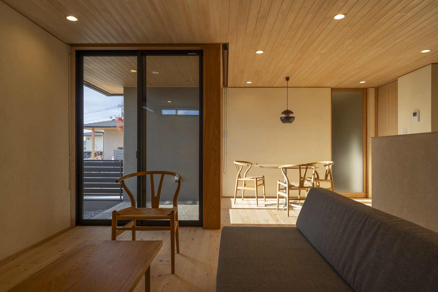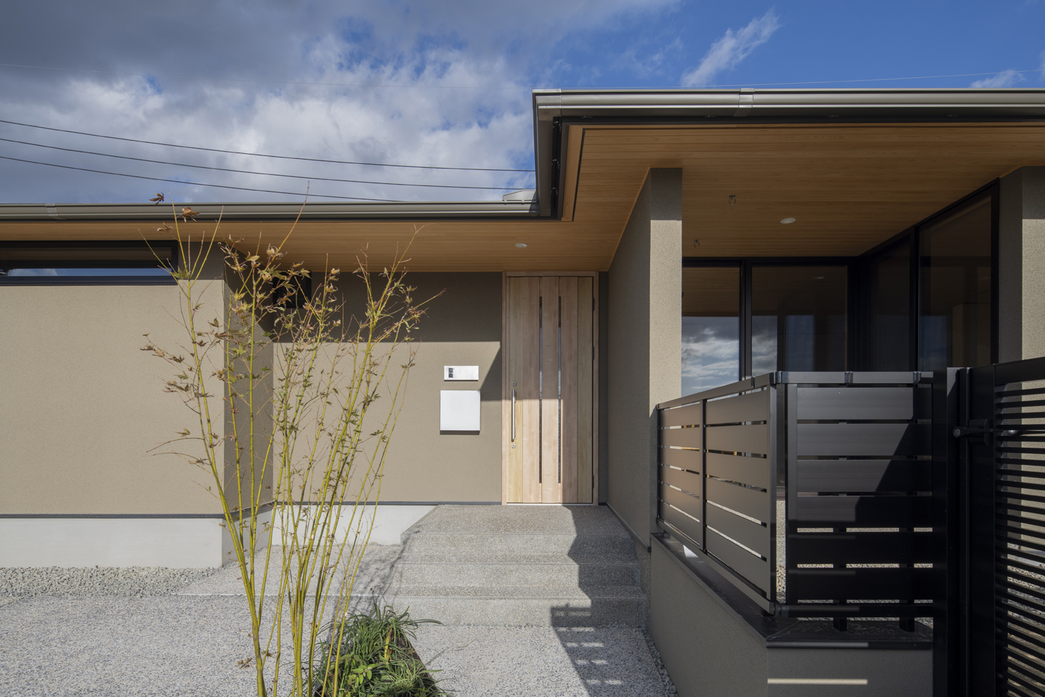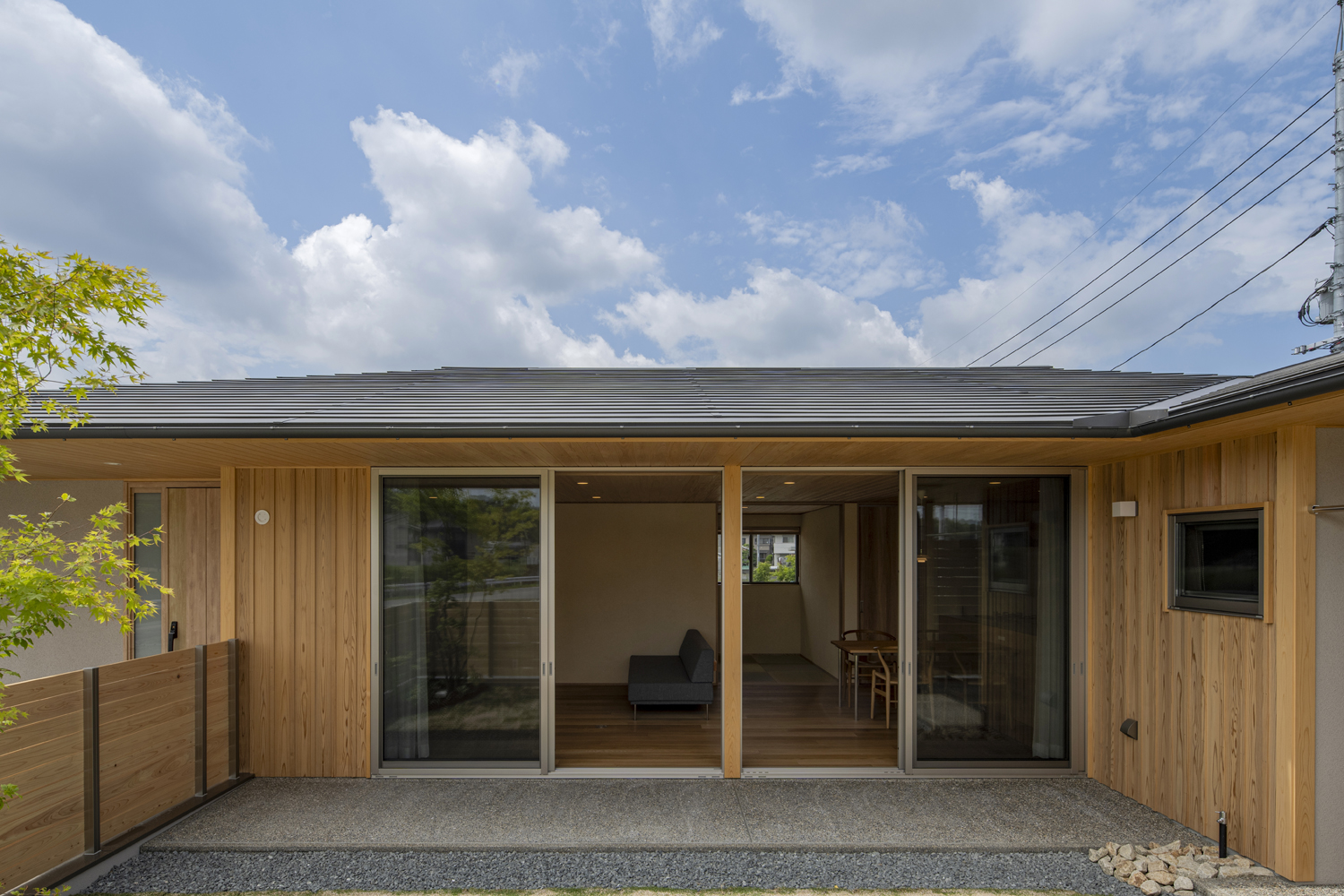 お引渡しをして約1年の【間(はざま)のいえ】は90坪の敷地に建つ38坪の平屋で、敷地内に3つの庭(前庭・中庭・奥庭)を計画し、庭に面するように平面を構成しました。方位の違う3つの庭は時間経過とともに様々な表情を見せてくれます。